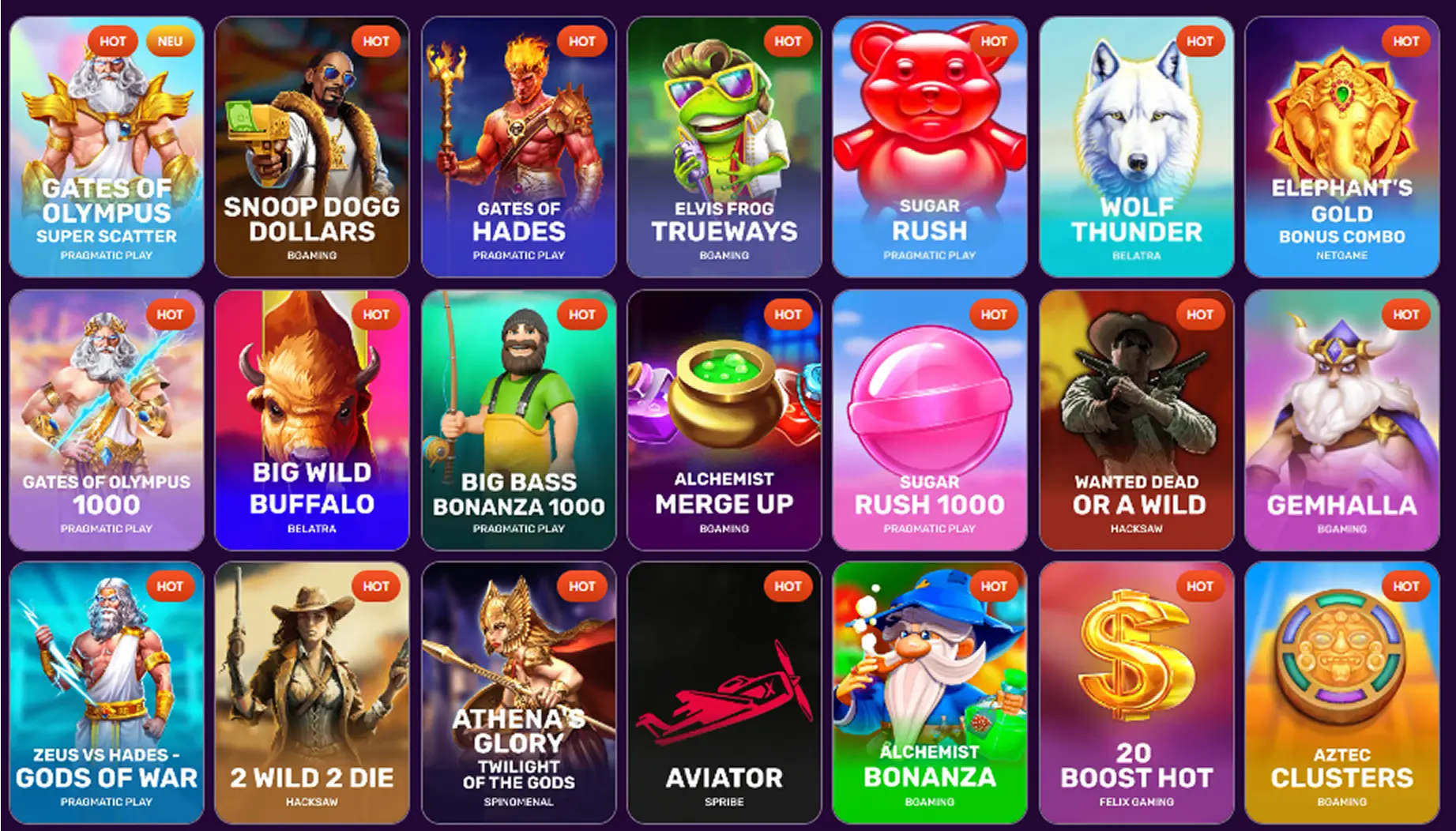 In unserer Spielebibliothek finden Sie klassische Früchte-Spiele, moderne Video Slots, Megaways-Titel, Jackpot-Beasts und alles, was dazwischen liegt. Nachfolgend zeigen wir Ihnen die beliebtesten Slots bei uns im Programm:
